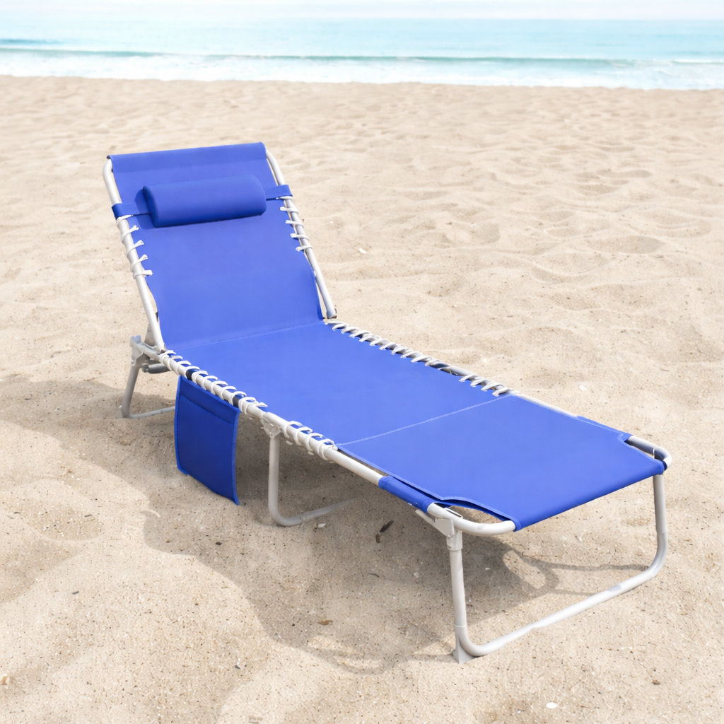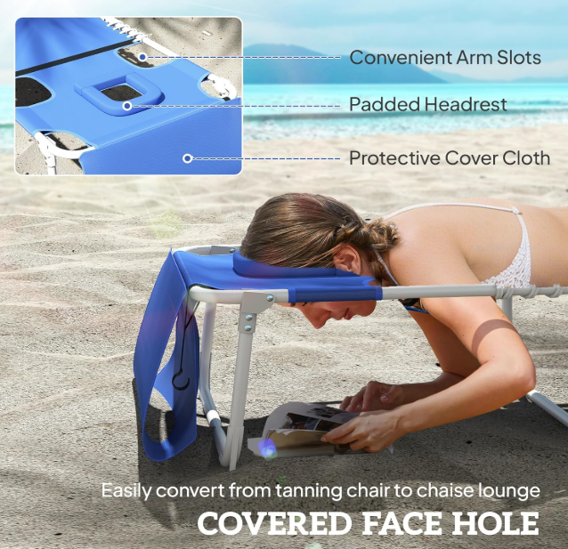 Stretch out and unwind with this versatile beach lounger designed for total comfort. With a five-position adjustable backrest, you can sit up to read, recline to relax, or lie flat—even face down thanks to the built-in face and arm holes—perfect for tanning, scrolling, or getting lost in a good book.
